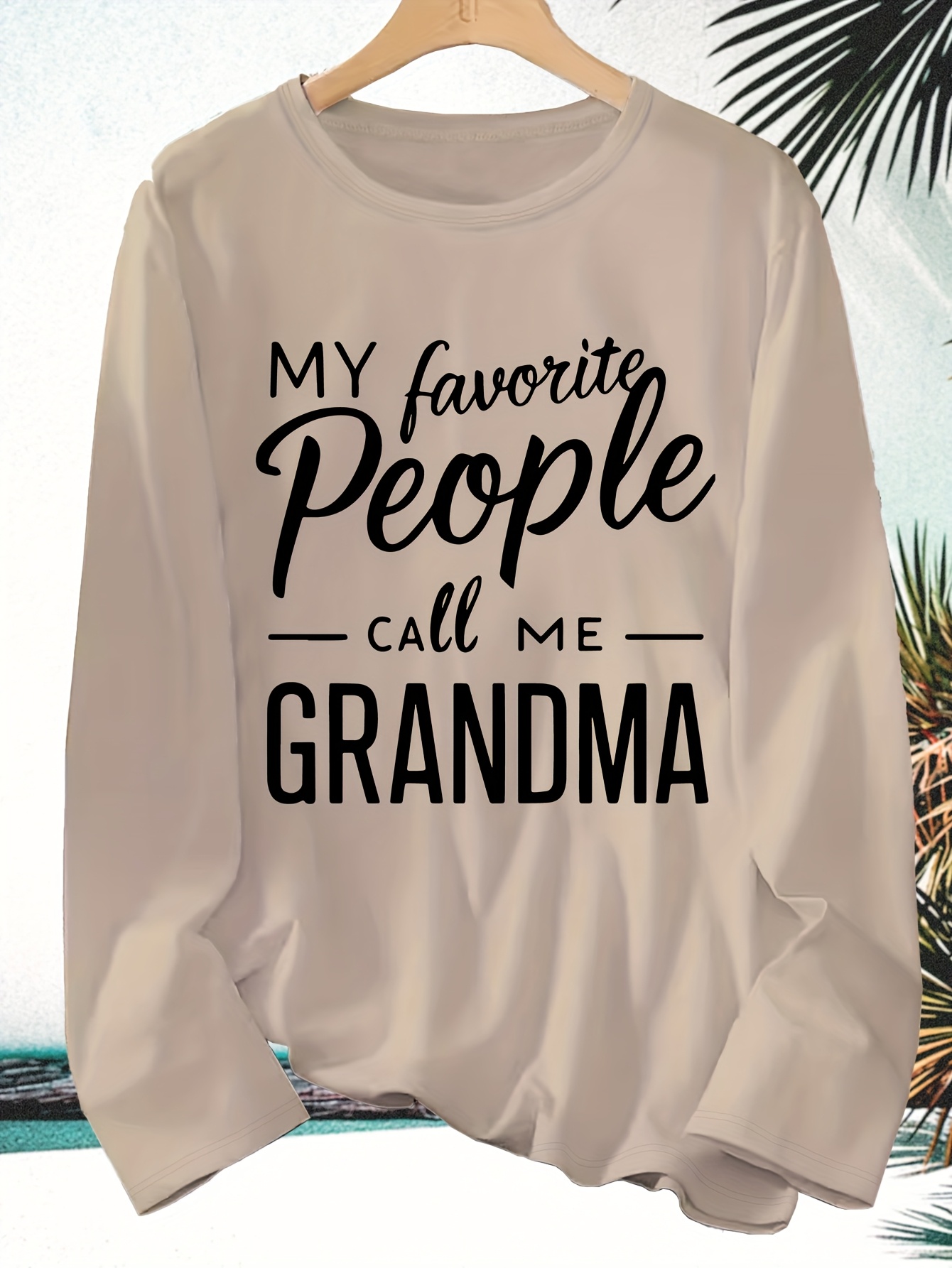 Women'S Long Sleeve Crew Neck T-Shirt with "My Favorite People Call Me Grandma" Letter Print, Casual Knit Polyester Top for All Seasons, Regular Fit Pullovers with Slight Stretch - 180gsm