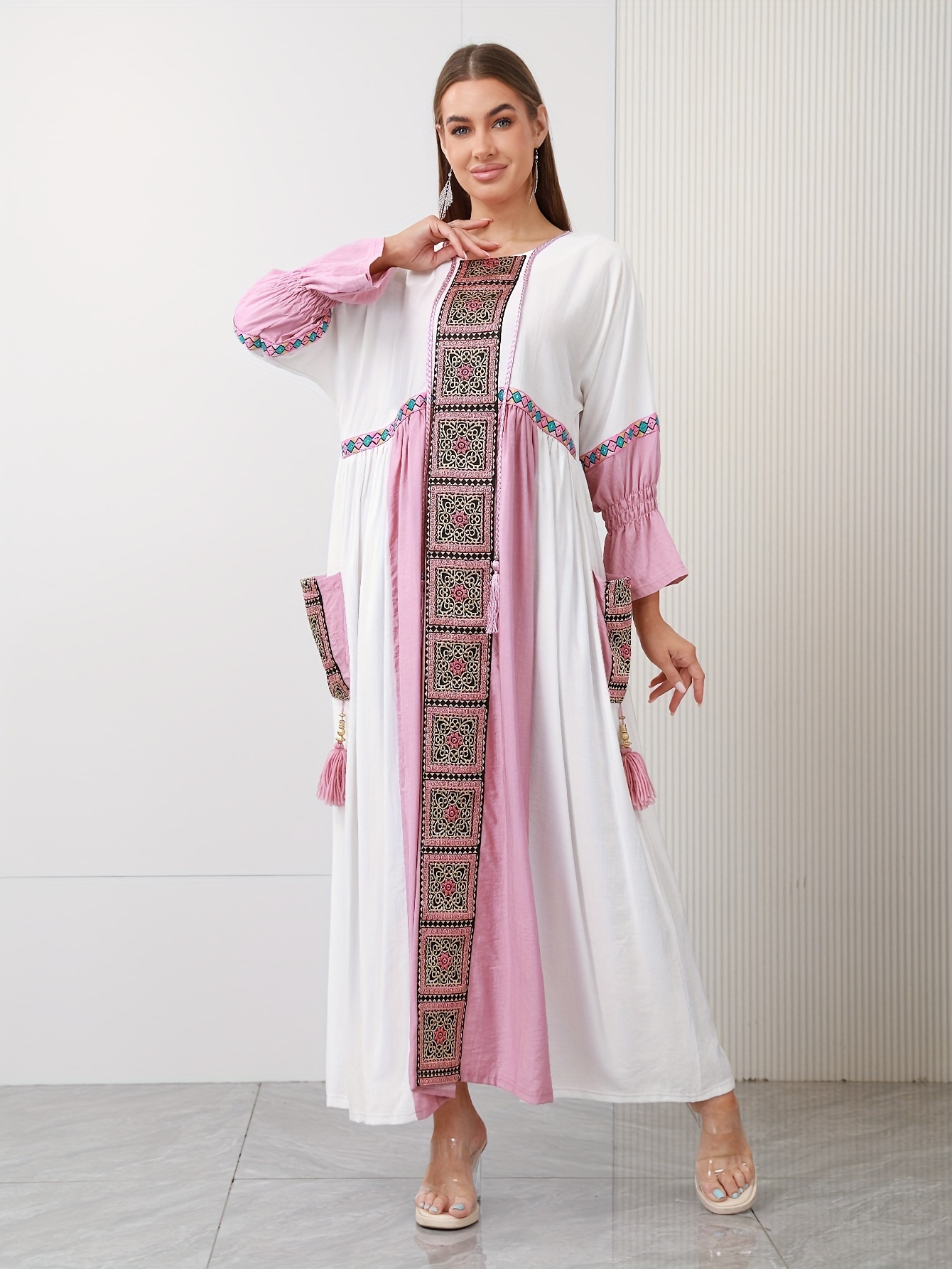 New Design Directional Palace Style Heavy Embroidery Pink Tassel Pendant Ruffle Elastic Three-Quarter Sleeve Double-Pocket Gown for Saudi National Day