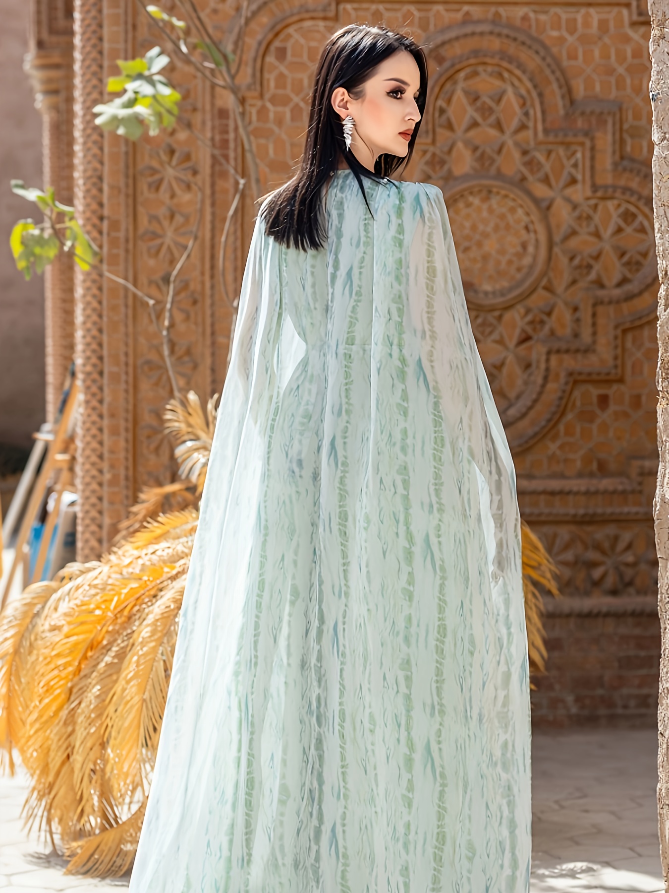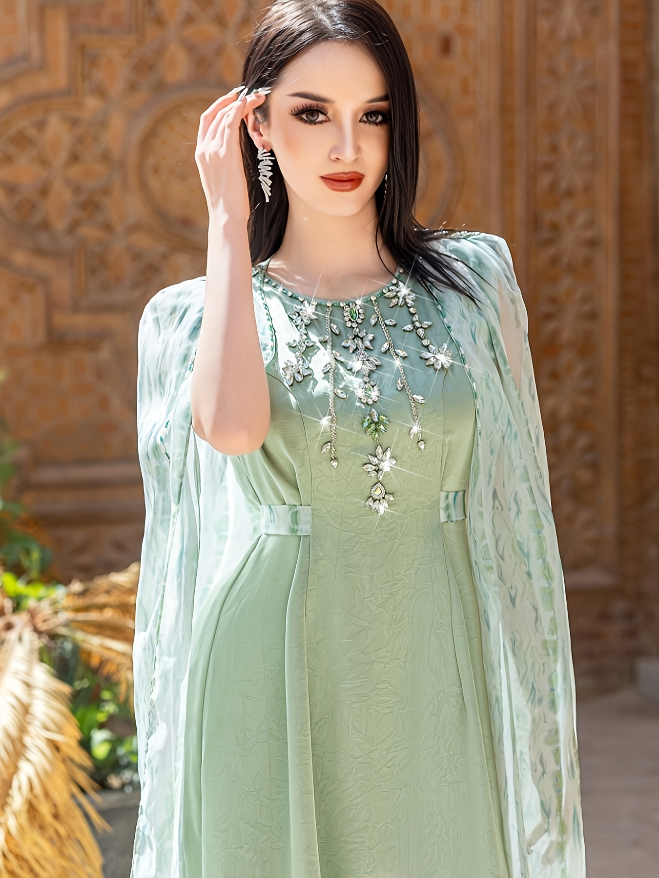 Women's Sleeveless Rhinestone-Embellished Mint Green Gown - Middle Eastern-Inspired Elegant Long Dress with Round Neck for Spring/Summer, Hand Wash Only