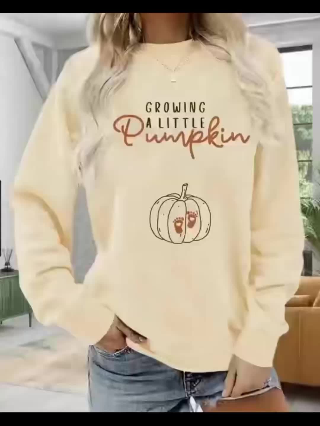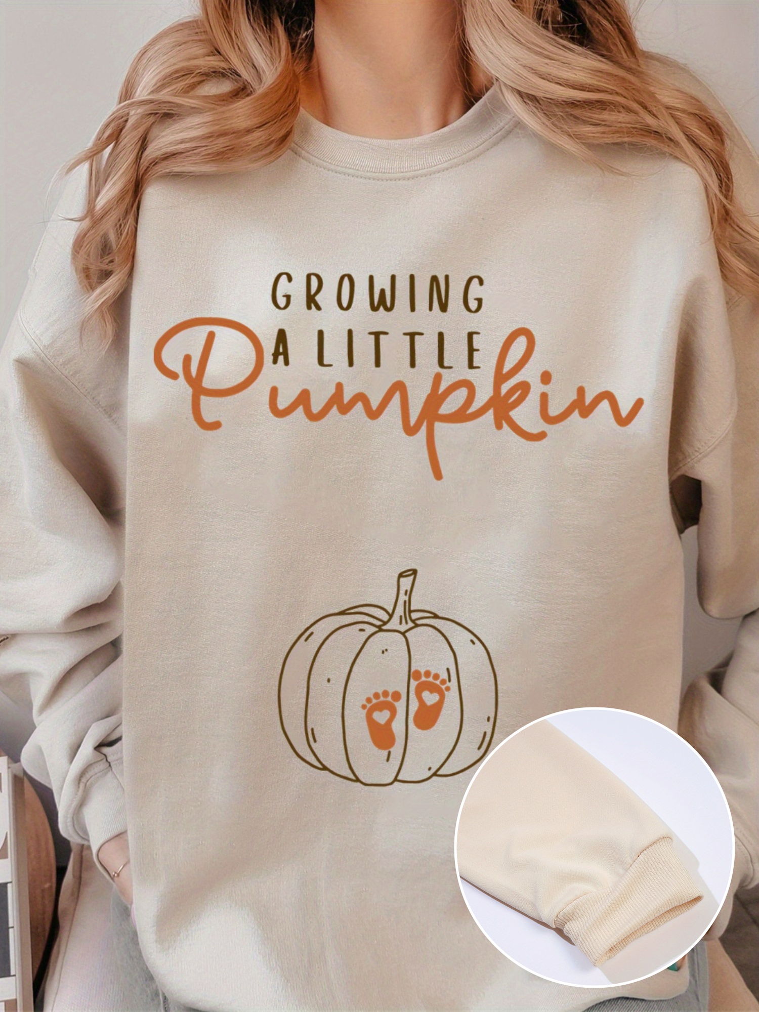 Women'S Casual Crew Neck Sweatshirt, Polyester Knit Fabric, 260gsm, with "Growing a Little Pumpkin" Letter Print, for All Seasons