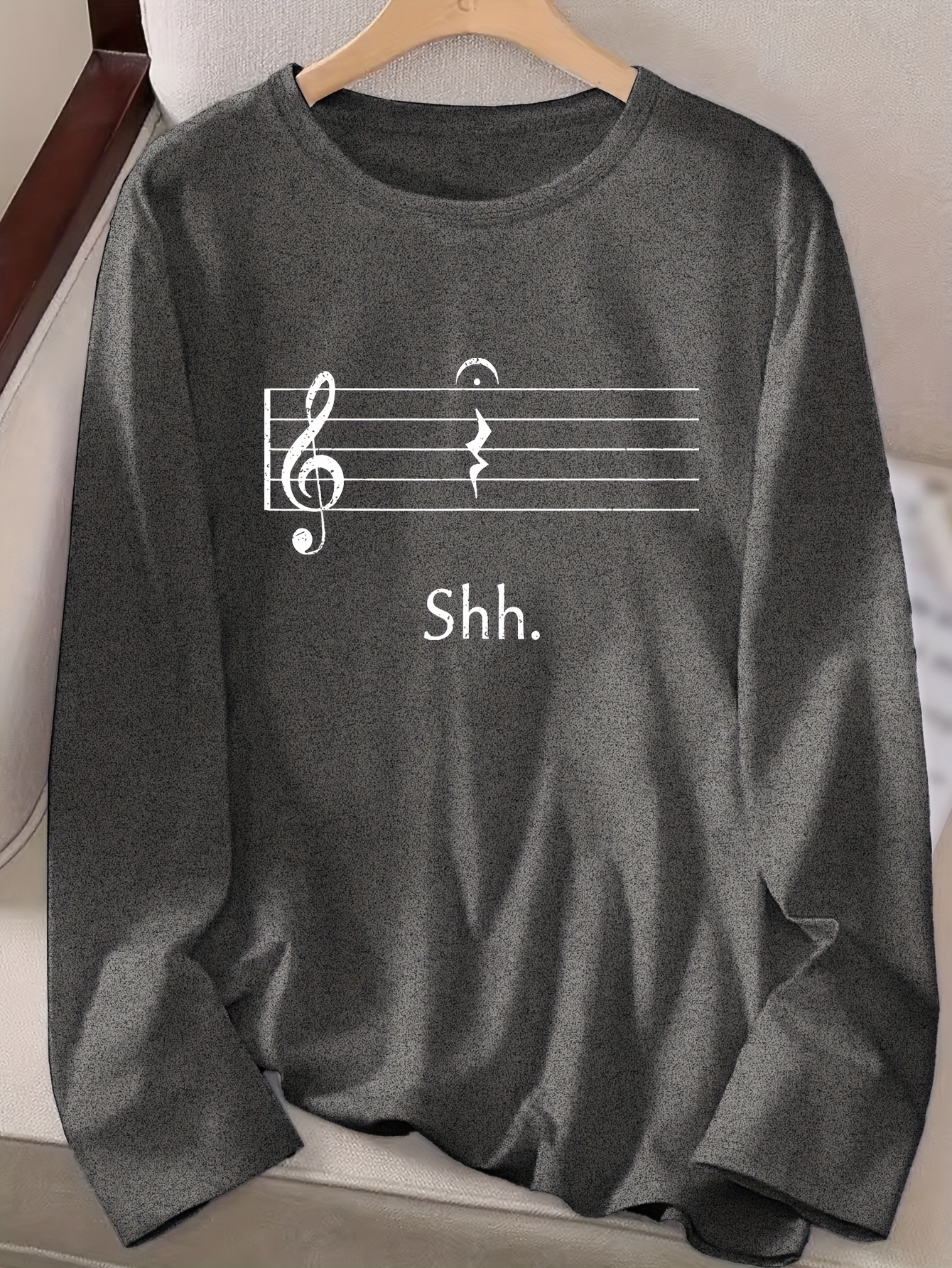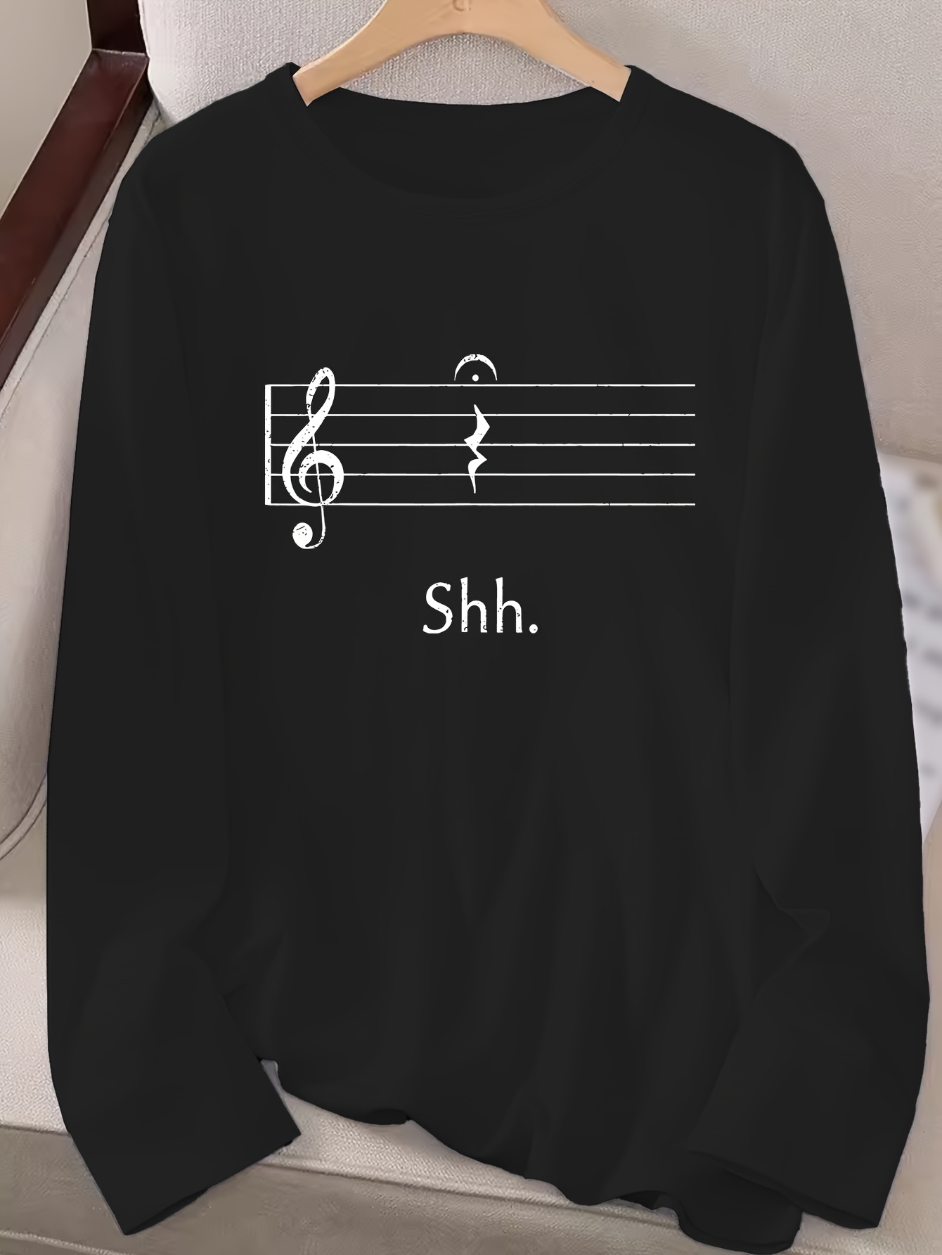 Women's Black Music Note Graphic Print Long Sleeve T-Shirt - Soft Stretch Polyester Crew Neck Casual Top with "Shh..." Text Design, Machine Washable for Fall & Winter