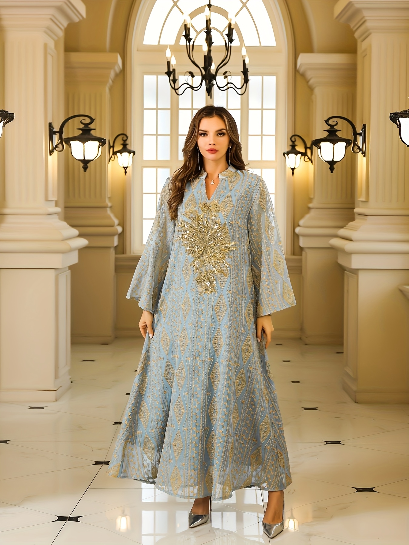 Luxury Muslim Women's Abaya Toga Dress with Golden Embroidery - Middle Eastern Style Long Sleeve Polyester Gown for Weddings & Formal Events, Loose Fit, Geometric Pattern, Hand Wash or Dry Clean, Muslim Clothes