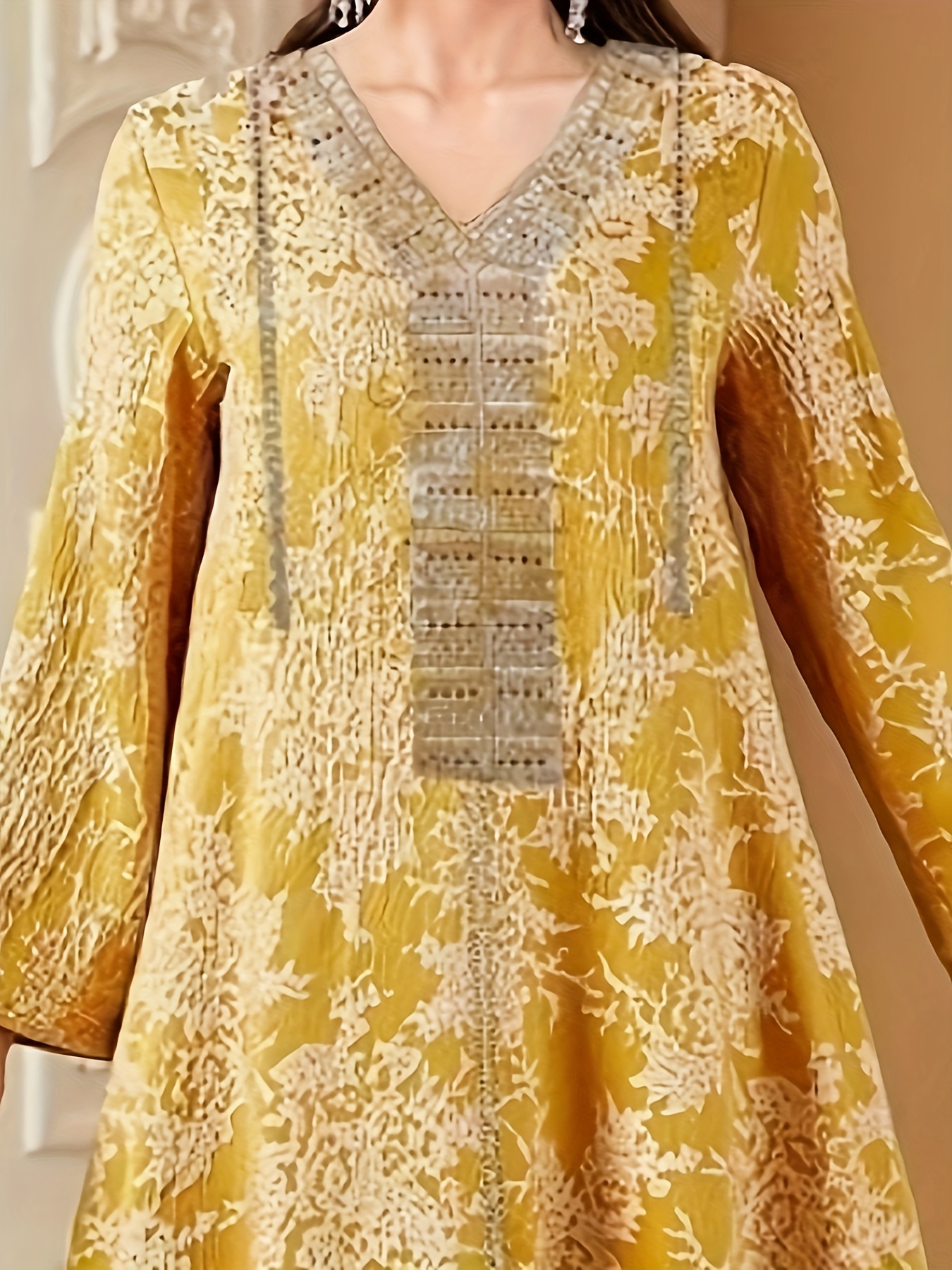 [Vintage Maxi Dress] Vintage-Inspired Elegant Maxi Dress | V-Neck, Long Sleeve, Floral Print, Loose Fit - Middle Eastern Embroidered Design for Vacation or Casual Wear
