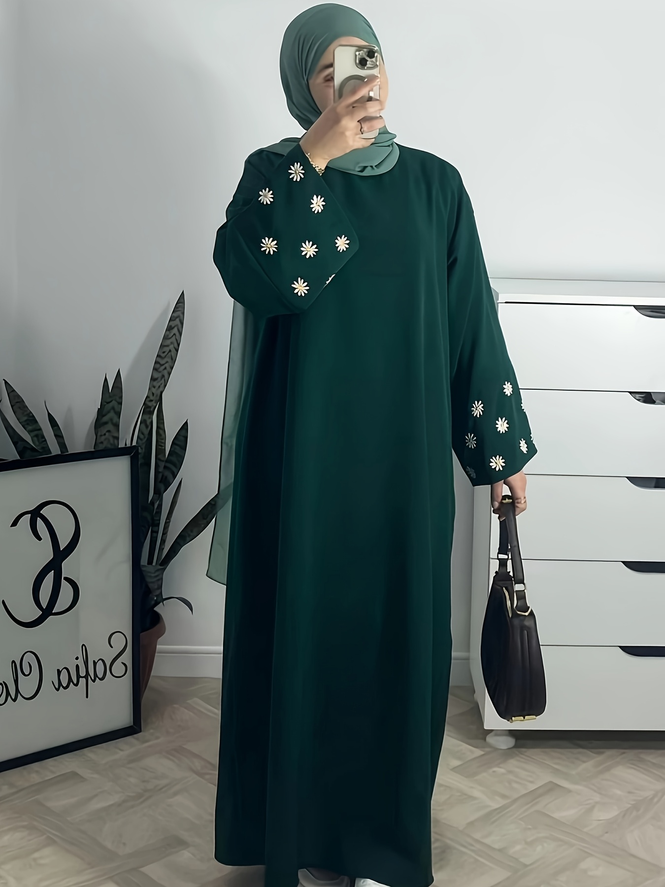 1pc Women's Islamic Abaya Dress - Elegant Hijab Outfit with Cuff Floral embroidery, Navy Blue Arabicrobe, Loose Fit Non-Stretch Muslim Dress for Daily Prayer, Office, Travel - No Scarf Needed, Modest Apparel, Quality Embroidery Detail