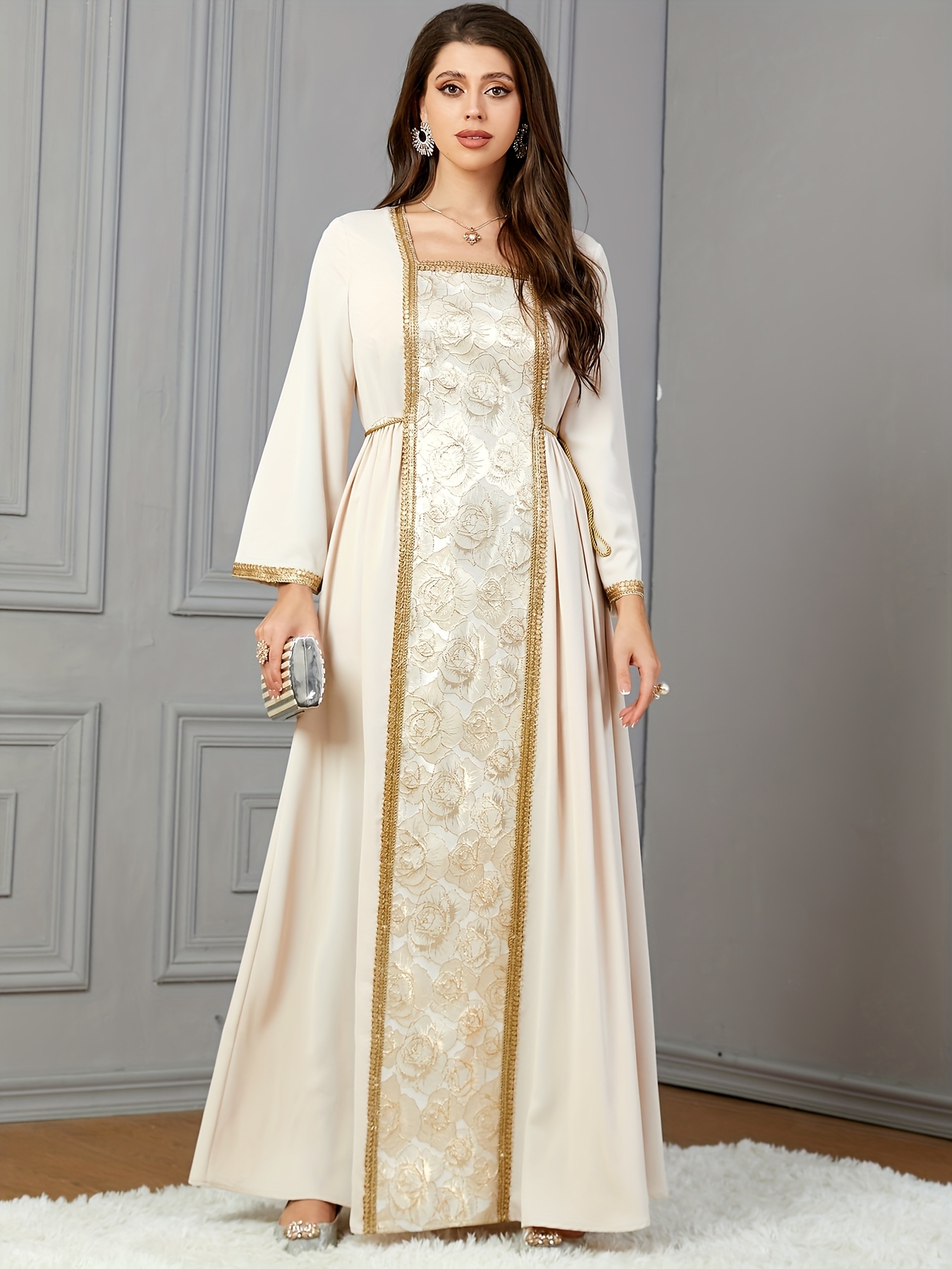Elegant Golden Embroidered Abaya Dress - Long, Elegant Dress with Intricate Golden Floral Patterns, Perfect for Eid Celebrations, Festive Attire|Elegant Abaya|Long Abaya