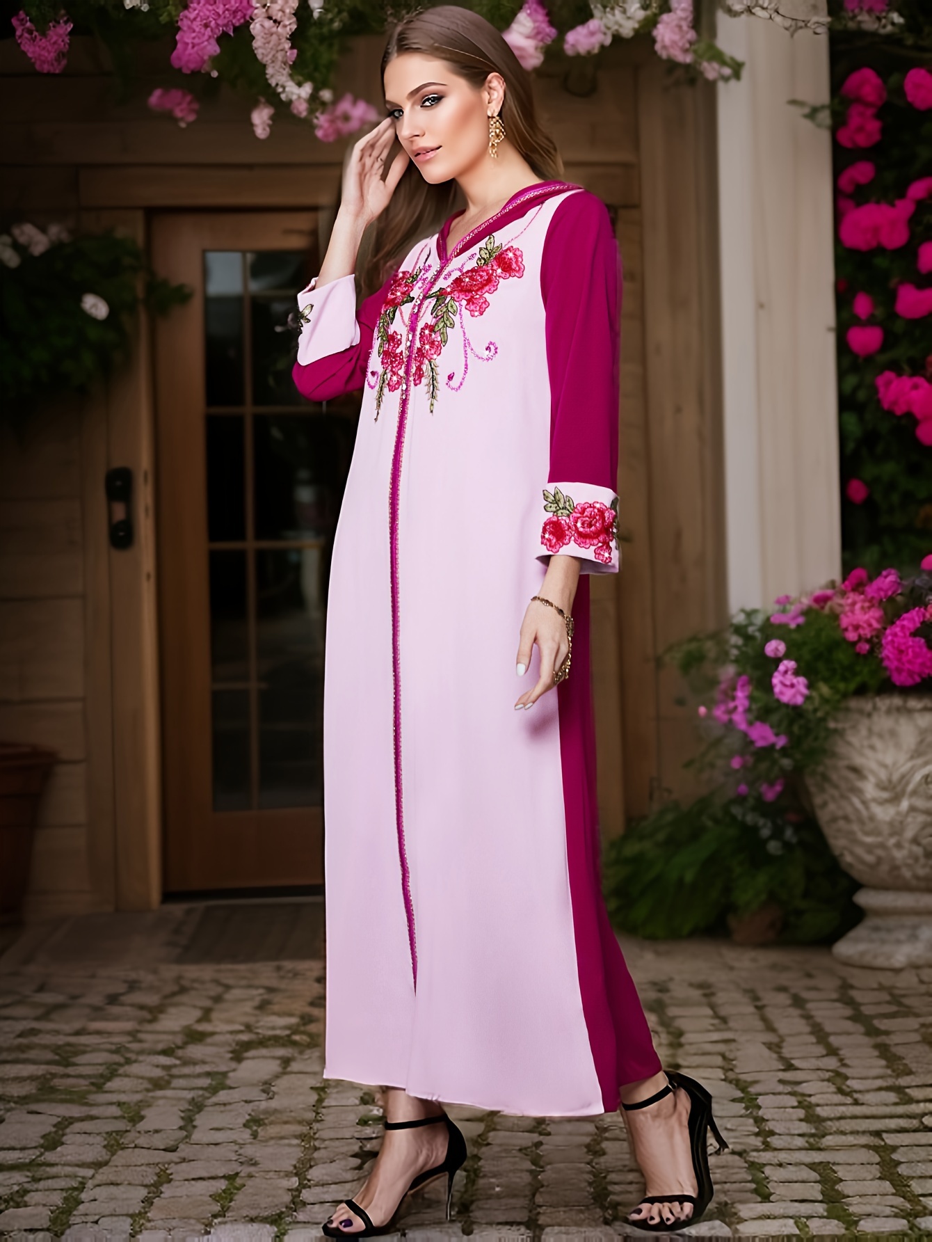 Women'S Elegant Long Sleeve Maxi Dress with Rhinestone Embellishments, Solid Color Polyester 100%, All-Season Woven Fabric, Regular Sleeve, No Belt - Pink & Magenta Floral Pattern