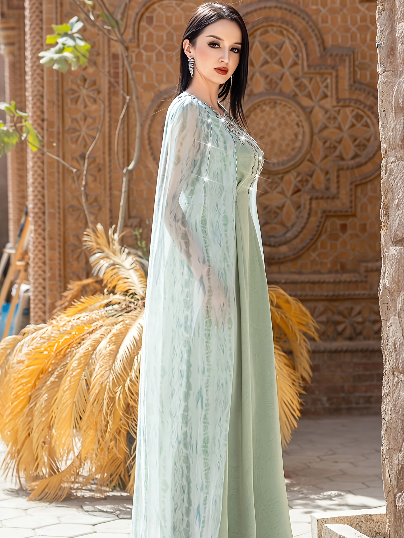 Women's Sleeveless Rhinestone-Embellished Mint Green Gown - Middle Eastern-Inspired Elegant Long Dress with Round Neck for Spring/Summer, Hand Wash Only