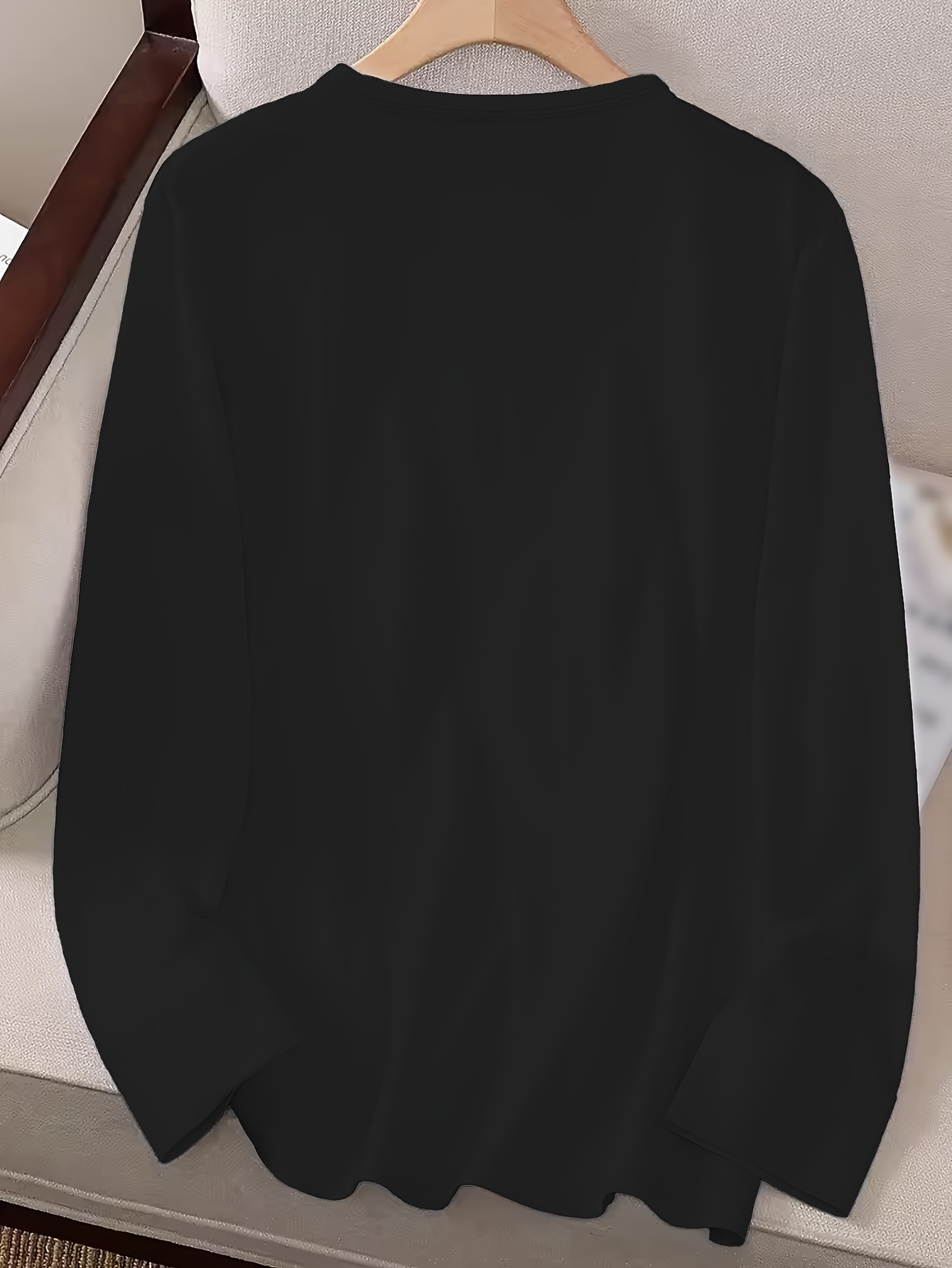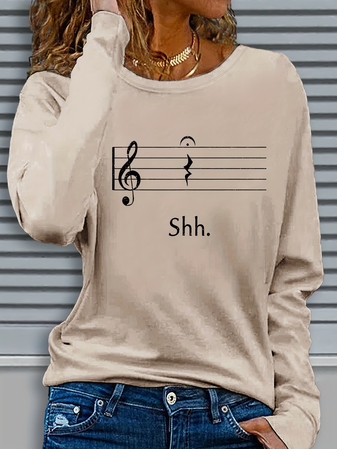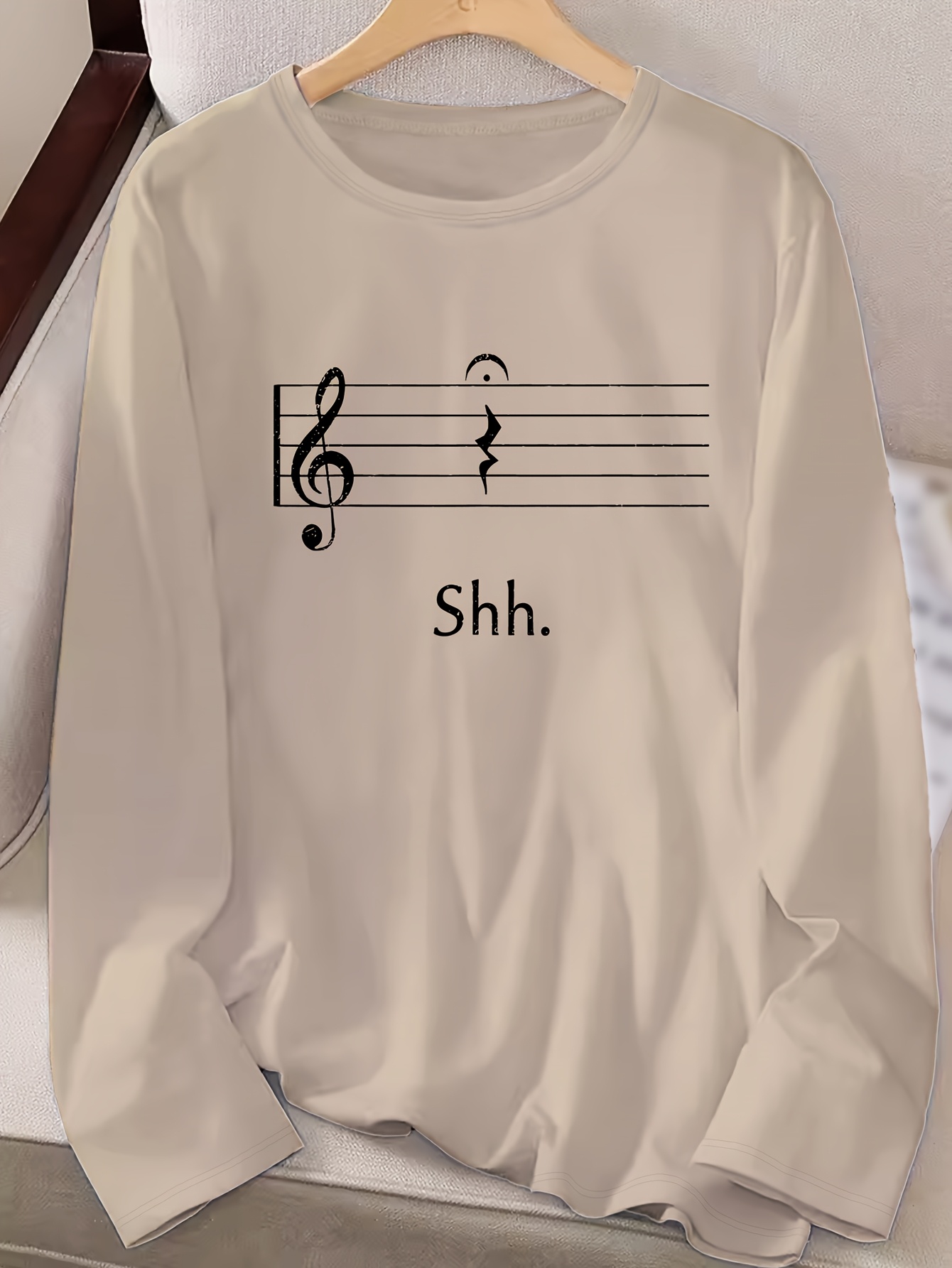 Women's Black Music Note Graphic Print Long Sleeve T-Shirt - Soft Stretch Polyester Crew Neck Casual Top with "Shh..." Text Design, Machine Washable for Fall & Winter