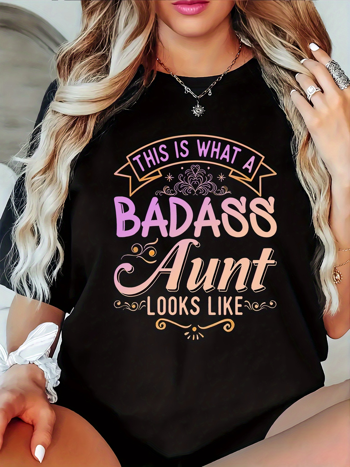 Women's Funny "Badass Aunt" Graphic T-Shirt - Bold Statement Black Top with Stretchy Fabric - Machine Washable Everyday Shirt for Women - Perfect Gift for Awesome Aunts, Casual Wear, Geometric Pattern Tee, Slight Elasticity