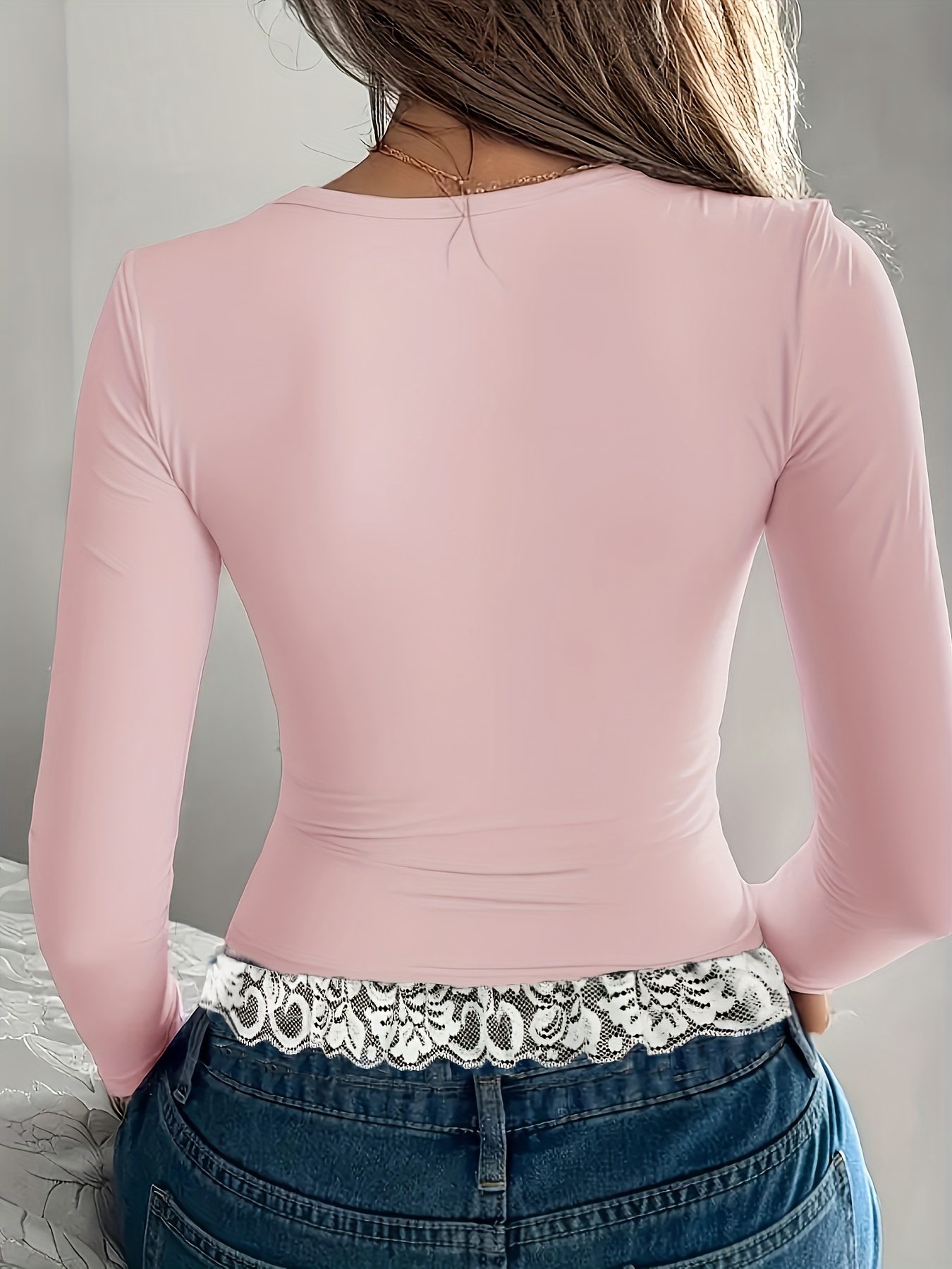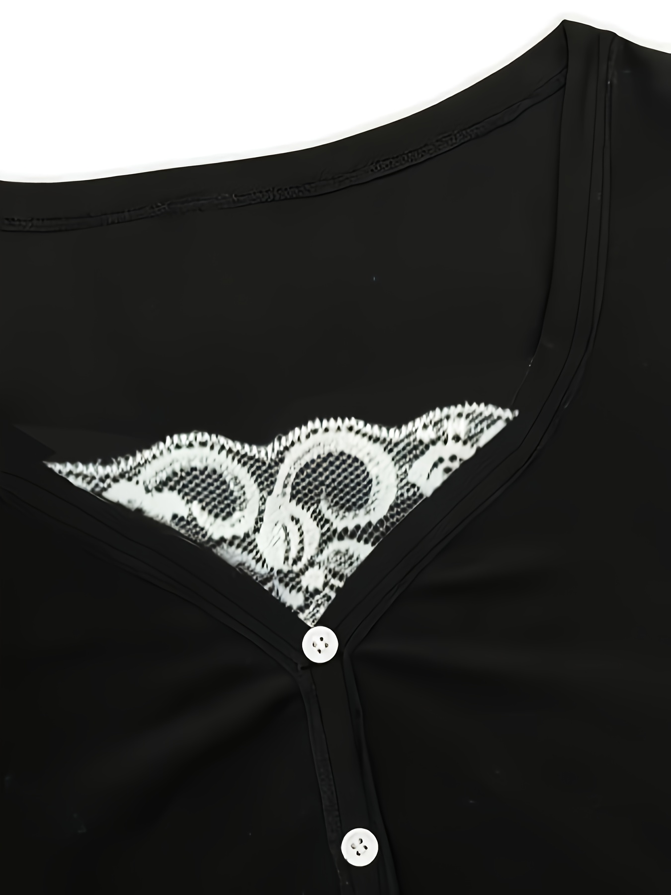 Women's Sexy V-Neck Blouse - Long Sleeve Fake Layering top with button front, All-Season Elegant Shirt for Office, Party, Everyday - Machine Washable Women's Clothing, Party Attire, Lace Detail Top