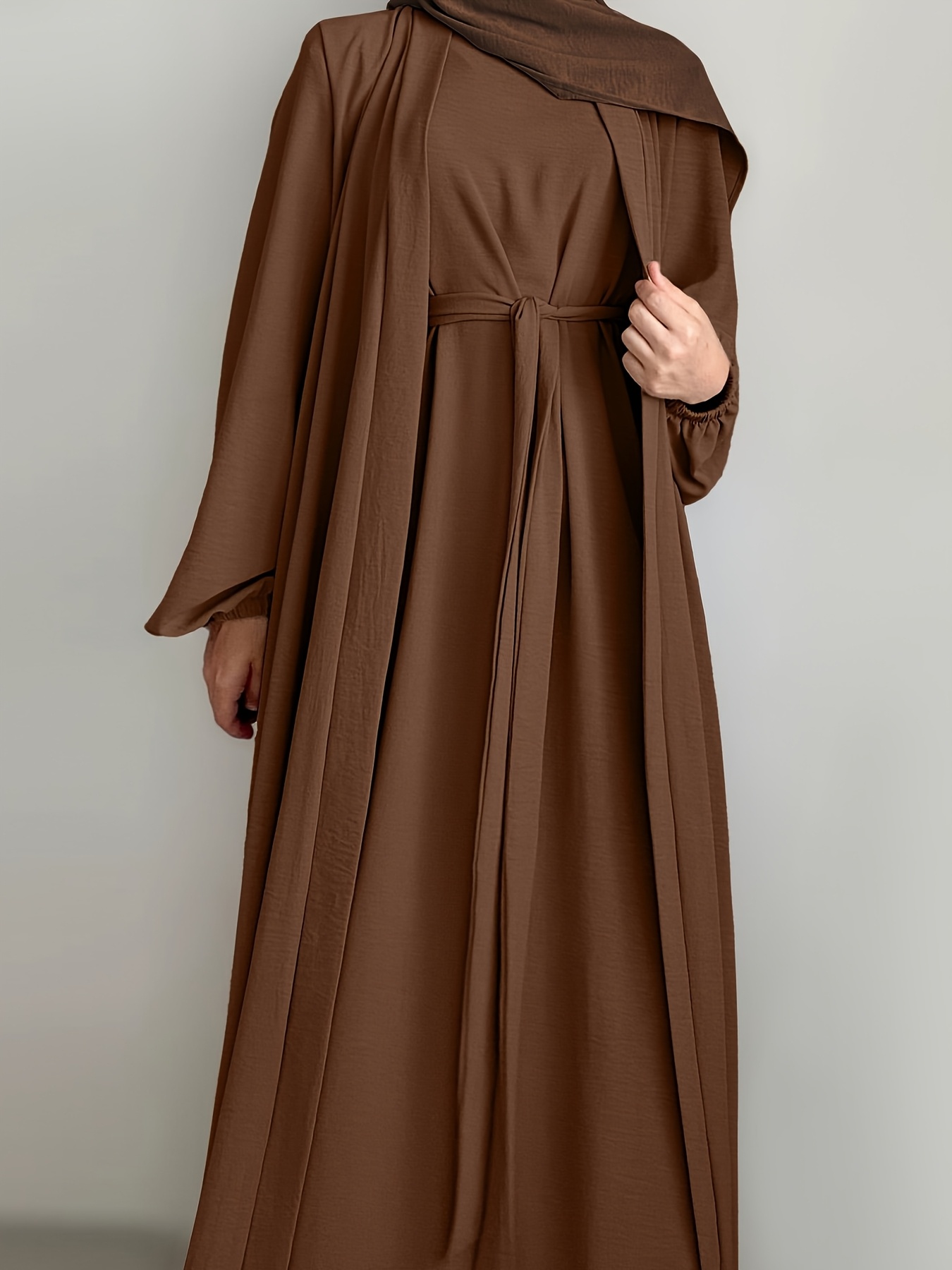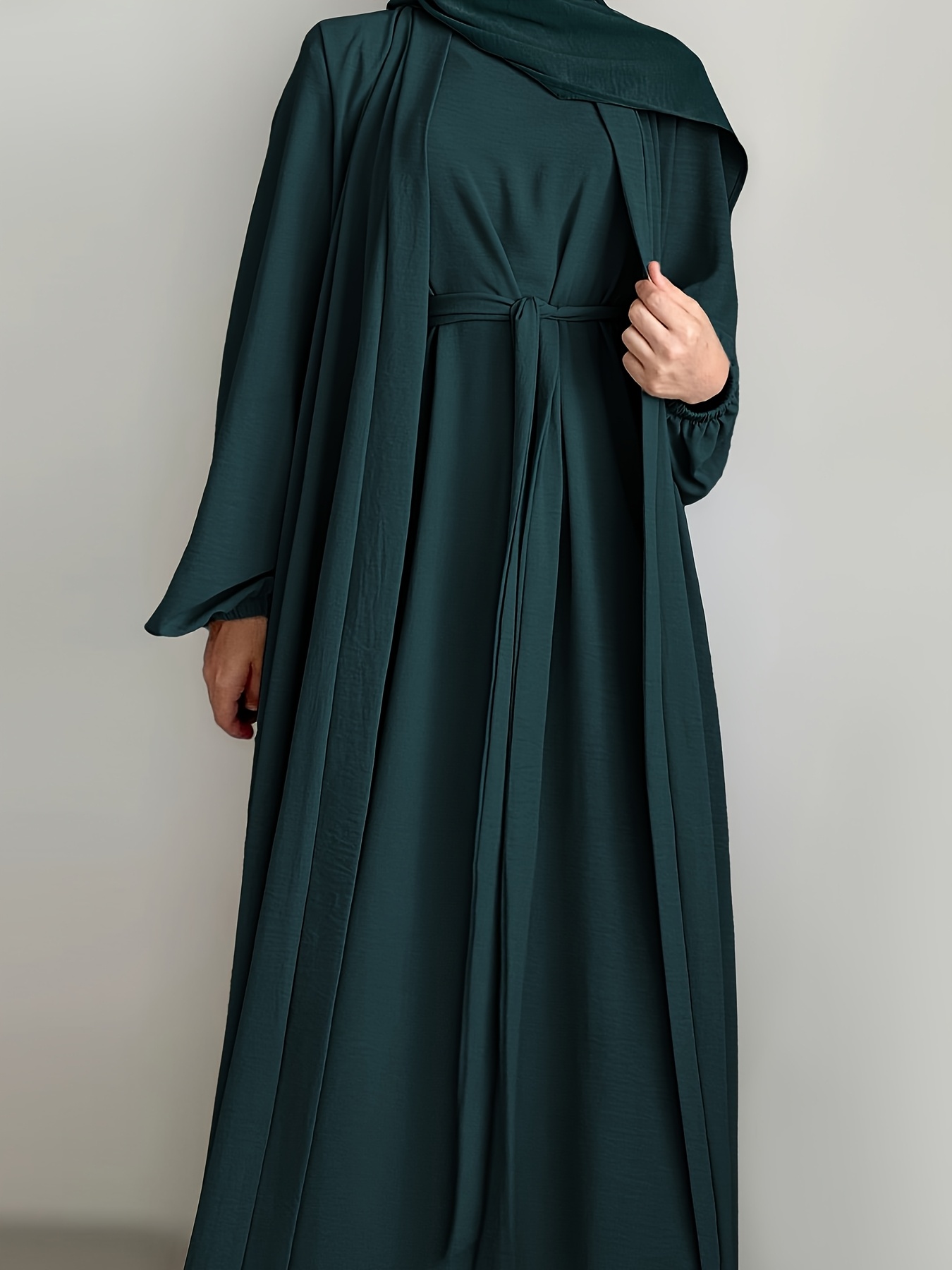 3pcs Traditional Middle Eastern Abaya Dress Set - Long Sleeve, Belted Waist, Solid Color, Non-Stretch Fabric, Spring/Summer/Fall Wear, Includes Cardigan, Dress, and Headscarf, Cultural Attire|Traditional Attire|Belted Waist Dress