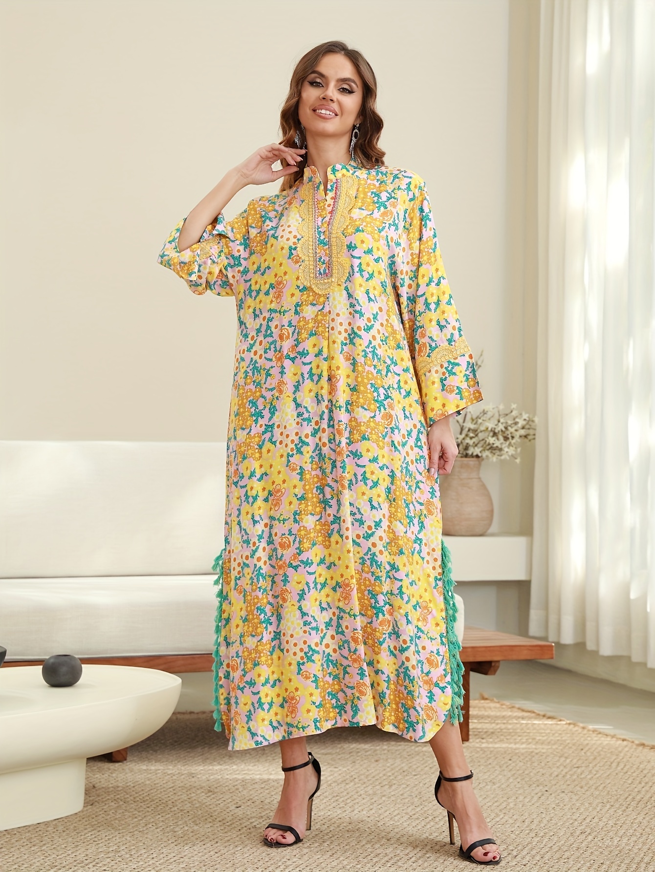Elegant Floral Print Abaya with Golden Accents - Long Sleeve, Mid-Length, Loose Fit, Slit Hem, Embroidered Detail, Perfect for Saudi National Day, All-Season Wear, Cultural Attire|Floral Print Abaya|Embroidered Detailing, Abaya Dress